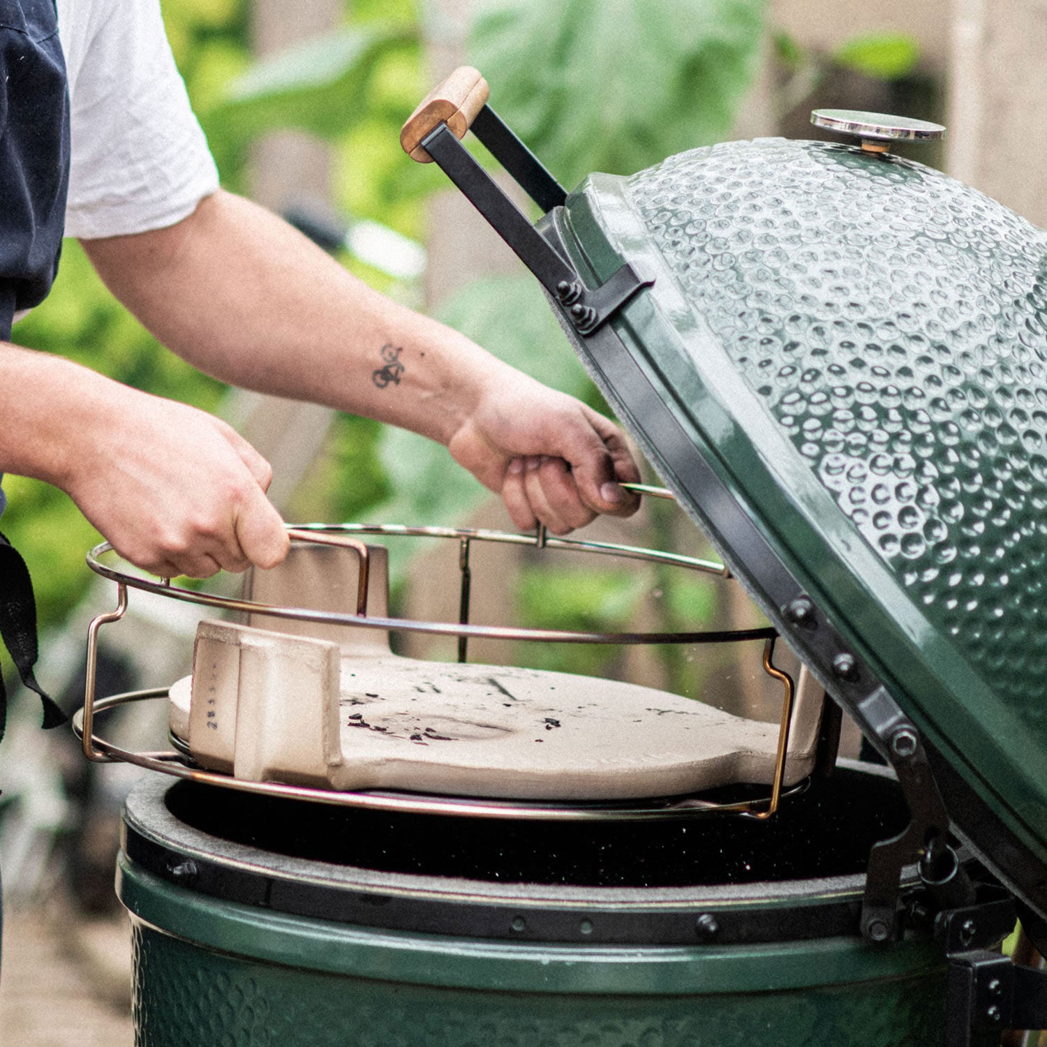 Load and light your EGG. Once the ceramics are warmed up and you are close to your recipe's target temperature, insert your ConvEGGtor onto the Fire Ring, place the Stainless Steel Grid on top and close the lid. The temperature will drop but don't worry, it will come back up. When you are 10˚C from your target temperature again, adjust your rEGGulator and Draft Door by half then in 1cm increments until the temperature stops fluctuating. After about 10 minutes, you'll be ready for a roast.