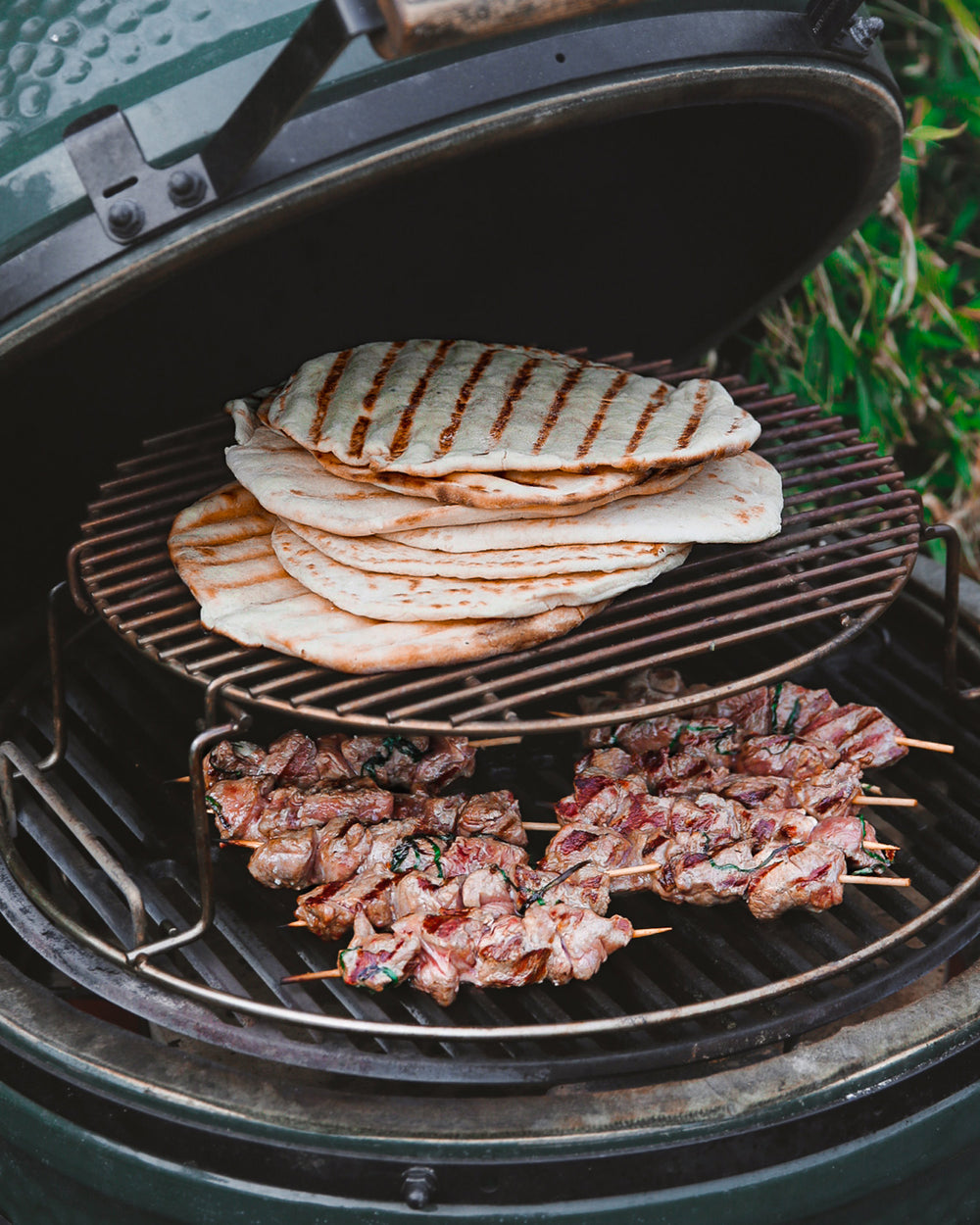 LEG OF LAMB WITH GREEN CHERMOULA, GARLIC YOGHURT, MEJADERAH & CHARRED AUBERGINE